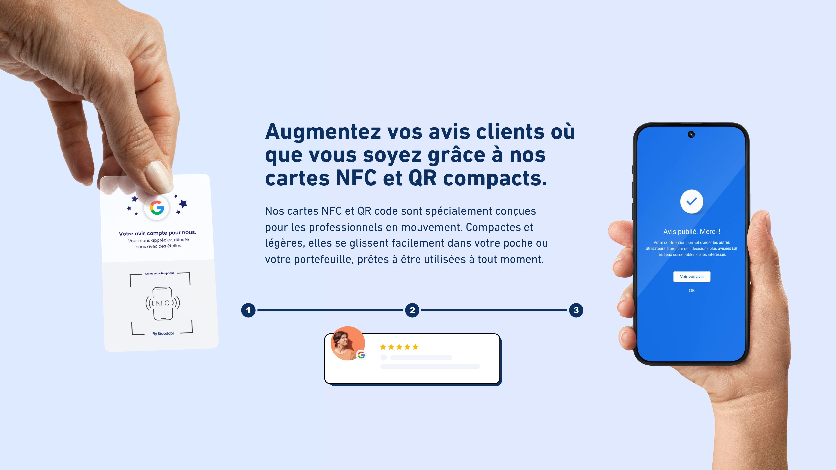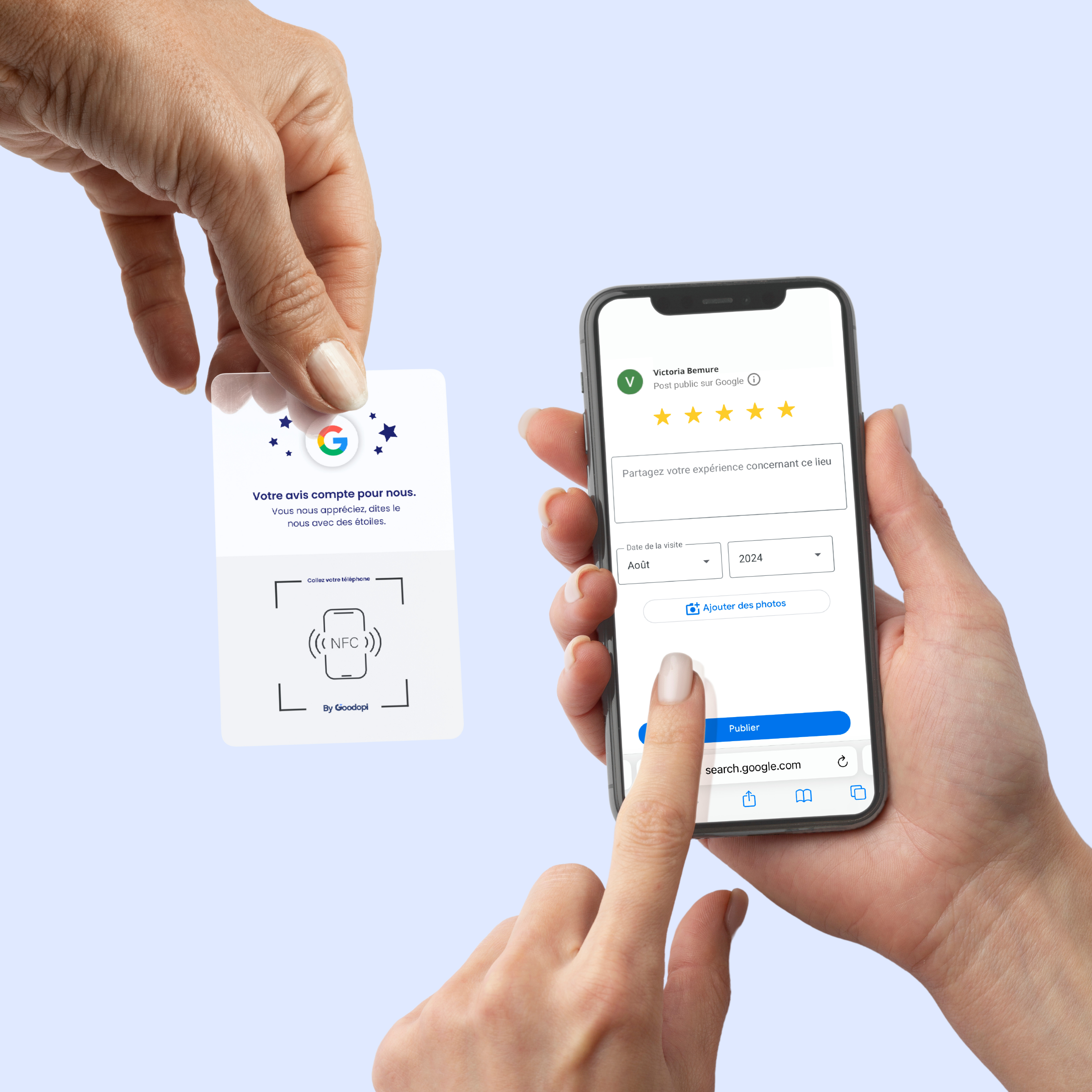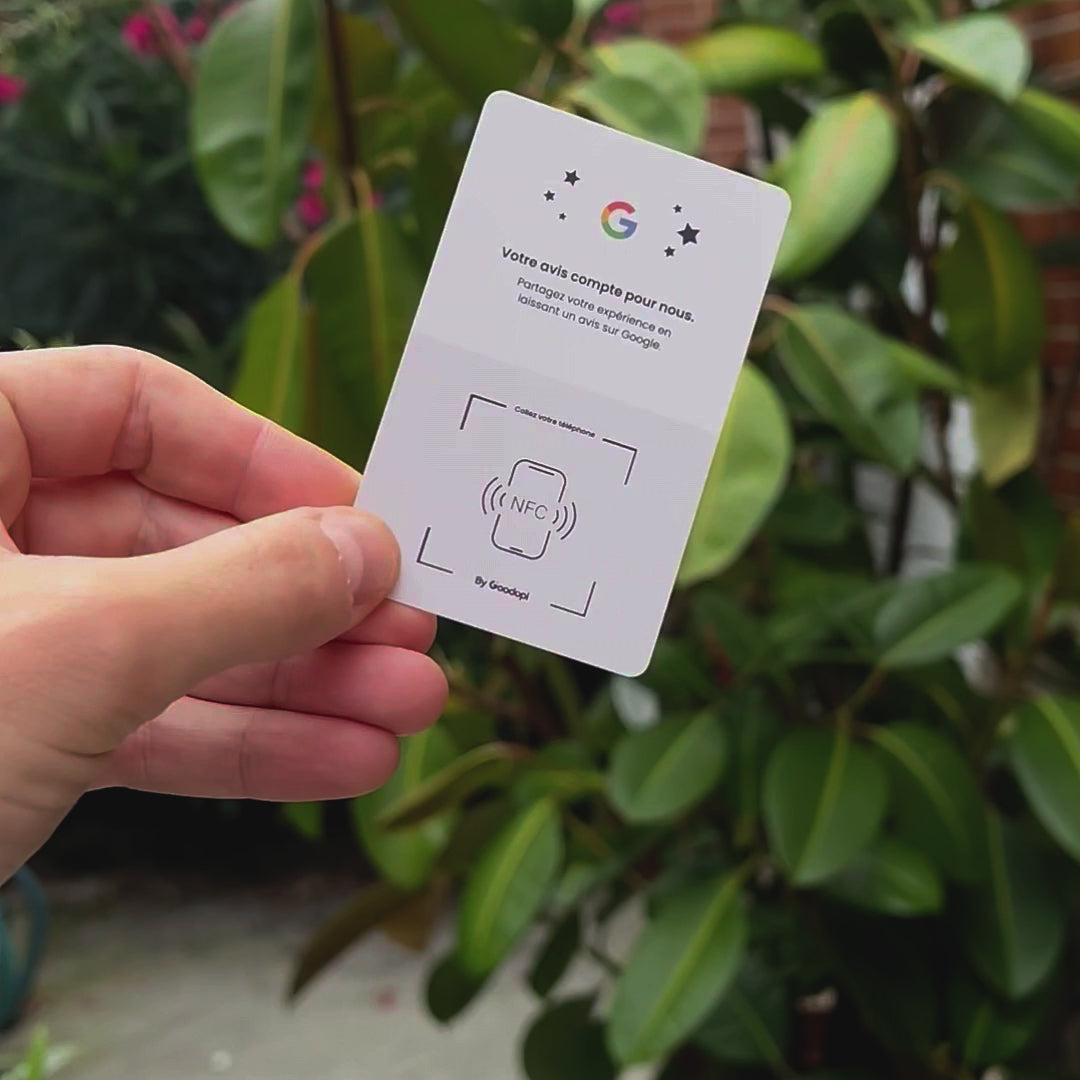 Une carte NFC est un dispositif qui utilise la technologie Near Field Communication (NFC) pour permettre à vos clients de laisser des avis facilement. En approchant leur smartphone de la carte, ils sont dirigés vers la page de votre entreprise sur Google où ils peuvent laisser un avis.